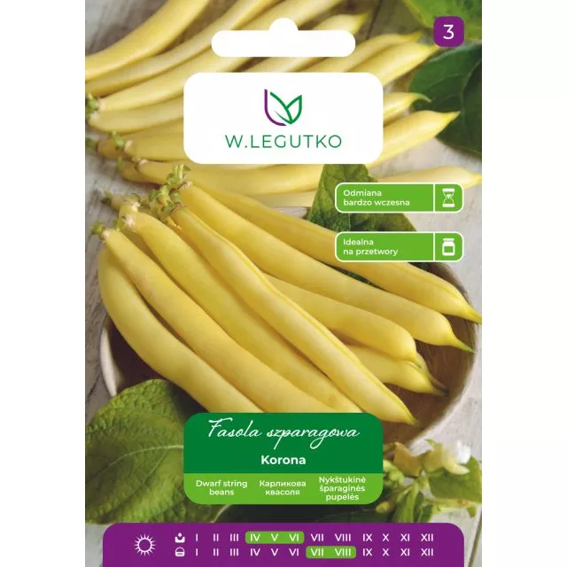 Fasola zwykła karłowa Korona 40 g to odmiana wczesna (okres wegetacji 60-65 dni), o żółtych, bezwłóknistych strąkach, przydatnych do bezpośredniego spożycia i do przetwórstwa.