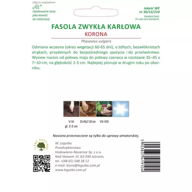 Fasola zwykła karłowa Korona 40 g to odmiana wczesna (okres wegetacji 60-65 dni), o żółtych, bezwłóknistych strąkach, przydatnych do bezpośredniego spożycia i do przetwórstwa. Wysiew nasion od połowy maja do połowy lipca w rozstawie 35-45 x 7-10 cm, na głębokość 2-3 cm. Najlepiej plonuje w drugim roku po oborniku.
