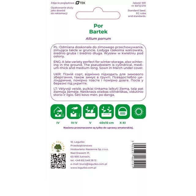 Por Bartek to odmiana późna doskonała do zimowego przechowywania, zimująca także w gruncie. Łodyga rzekoma walcowata, średnio gruba i średnio długa. Wysiew w marcu pod osłony. Wysadzać do gruntu w maju w rozstawie 30-50 x 15-20 cm zależnie od sposobu uprawy. Sadzić wprost do gruntu na początku kwietnia w rzędy jak wyżej. Wymaga gleby żyznej, próchniczej, zasobnej w wodę, głęboko uprawionej.